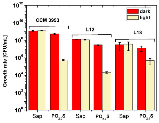 The hybrid films were prepared according to the protocol described in Scheme 1. Antimicrobial activity was estimated against all three S. aureus strains. Pilot experiments indicated better reproducibility of the results of biological experiments with PO2.0S-type films, which might be related to some properties of the tested films as discussed above. The bacterial growth rate was very high (107–109 CFU/mL) under both dark and light on a Sap-coated cover glass (control group), while the PO2.0S film only exhibited slightly decreased growth compared to the Sap control group in the dark. However, the strains of S. aureus CCM 3953, L12, and L18 exhibited reductions of 3log10, over 3log10, and over 2log10, respectively, after irradiation (p < 0.05; Figure 6). These results demonstrated antimicrobial activity of the PO2.0S film but showed diversity in the growth rate of tested strains, suggesting differences in biofilm-forming capacity. On the other hand, efficiencies on MRSA strains suggested that the effect of the PO2.0S film is not associated with MRSA phenotype, but is strain-specific [57].