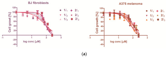 The human normal fibroblast cell line was BJ HEP (code CRL-2522), from American Type Culture Collection (ATCC) acquired through LGC Standards GmbH, Wesel, Germany. The cells were cultivated in Eagle’s Minimal Essential Medium (MEM), supplemented with 10% fetal calf serum (FCS). The malignant melanoma cell line, A375 was from European Collection of Authenticated Cell Cultures (ECACC), through Sigma Aldrich Company, St. Louis, MO, USA. A375 cell line was cultivated in Dulbecco’s Modified Eagle’s medium (DMEM), supplemented as well with 10% FCS. All media and supplements were from Sigma Aldrich Company. The general instrumentation for in vitro testing were: Class II laminary hoods Lamil Plus 13 from Karstulan Metalli Oy, Karstula, Finland; 32R centrifuge with spin-out rotor from Hettich Lab Technology, Tuttlingen, Germany; Observer D.1 inverted phase fluorescence microscope from Carl Zeiss (Jena, Germany); Heto Ultrafreezer (Heto Holten, Allerd, Denmark), Cryosystem 2000 liquid nitrogen locator (MVE Bio-Medical Division, Burnsville, MN, USA).