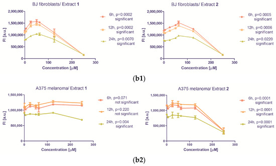 The Alamar Blue fluorescent stain indicates the intracytoplasmic reducing capacity of the cells, implicitly their metabolic status. The comparison between the fluorescence measured in presence or absence of treatment with 1 or 2 reflects their antiproliferative capacity. For this purpose, the modulation of the reducing capacity was assessed with the same concentration range of 1 and 2 was used as for the cytotoxicity testing. The cells’ exposure to zeaxanthin from Goji extracts 1 and 2 caused a decrease in fluorescence, proportionally with the concentration and the exposure time (6, 12 or 24 h, Figure 2, Table 2). In BJ normal cell line and A375 malignant melanoma, extract 2 exhibited antiproliferative activity. The activity of 1 was statistically significant in BJ cells, and in A375 after 24 h of treatment (Figure 2).
