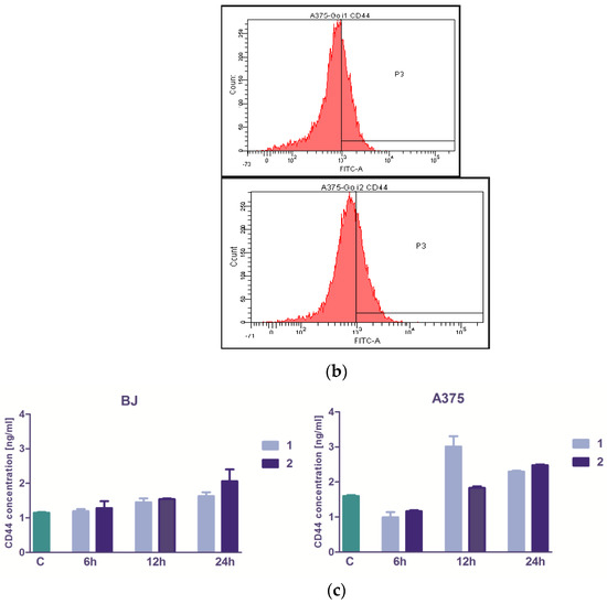 The modulation of CD44 membrane marker expression and the level of secreted CD44 protein in normal BJ versus A375 tumor cells treated with zeaxanthin-rich extract from Goji berries in vitro. The histograms represent the distribution of CD44-positive BJ cells (a) and CD44-positive A375 cells (b) in untreated control versus treatment with 50μM zeaxanthin-rich extract 1 and 2, respectively. In the lower row (c): the level of secreted CD44 protein by the normal BJ and malignant A375 cells following the same treatments; the columns correspond to the untreated control C and zeaxanthin-rich extracts 1 and 2.