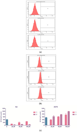 The soluble form of total p65 NF-kβ was quantified immunoenzymatically with the ELISA testing. The basal values were lower in fibroblasts than in melanoma cells, and the variations in intercellular NF-kβ concentration were not dose-dependent in BJ cells, although a clear tendency of NF-kβ drop was observed, opposite to A375 cells where 50 µM subcytotoxic and 100 µM cytotoxic concentrations both conducted to NF-kβ increase (Figure 5). The flow cytometry showed that the expression of intracytoplasmic phosphorylated form of NF-kβ in BJ cells was nearly zero, and the treatment with 50 µM 1 or 2 does not influenced this molecule. Instead, in A375 cells, the basal activation was higher (Figure 5), which is in concordance with previous findings [44] and the extracts caused a significant increase in NF-kβ: 14.60% versus 5.75% for 1 and 18.50% versus 5.75% for 2, the tendency of increase being correlated with the soluble NF-kβ for the same treatment (Spearman nonparametric correlation, r 0.94, p value 0.0083, very significant).