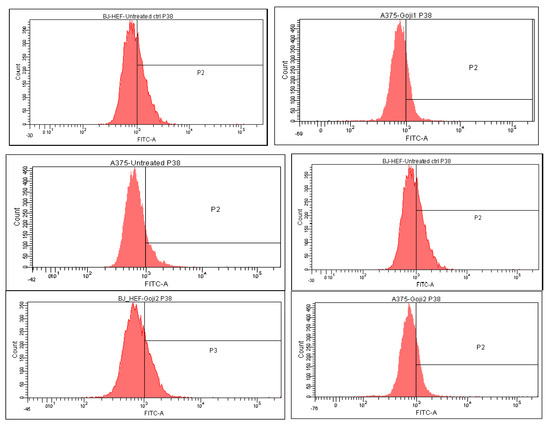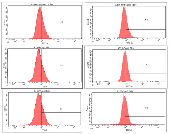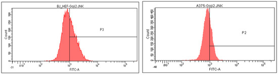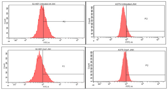 The strongest selectivity was observed as well in the effect of 1 on JNK, the difference between the normal and tumor cells being 146.08% (Figure 6). The distribution of p38-positive cells (Table 4, Figure 7) and the ERK-positive cells (Figure 8) following the 24-h exposure to Goji extracts 1 and 2 showed similarities: in both cases, the percent of positive cells augmented significantly (one-way ANOVA test, p < 0.05) in A375 tumor cells, while in normal BJ cells the expression of ERK and p38 was suppressed.
