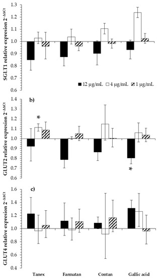 The expression of GLUT2 was also modulated in two distinct ways (Figure 2b). Gallic acid (12 µg/mL) significantly downregulated GLUT2 expression by 20% (p ≤ 0.05) compared with the respective control. However, Farmatan and Contan at 12 µg/mL also downregulated the expression of GLUT2 by 21% and 14%, respectively. Gallic acid significantly reduced (p ≤ 0.05) GLUT2 expression by 20% at the same concentration, while 4 µg/mL of Tanex significantly upregulated the expression of GLUT2 by 11% (p ≤ 0.05). At a concentration of 1 µg/mL, no notable impact of the wood extracts was determined. Concentrations of 4 and 1 μg/mL had a positive effect on the expression of GLUT2.