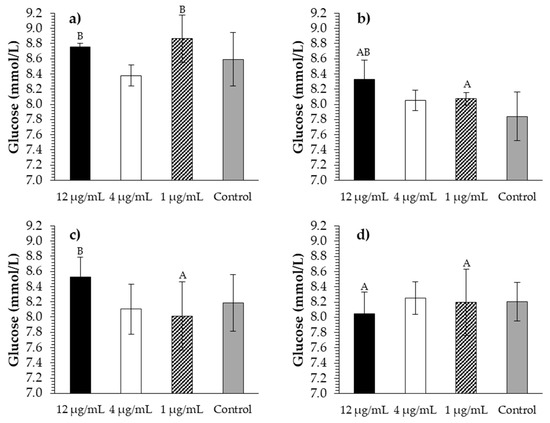 Glucose bioavailability and transport through CLAB cells. (a) Tanex; (b) Farmatan; (c) Contan; (d) gallic acid. Results presented as mean glucose concentration of independent triplicates ± standard deviations. Capital letters represent statistically significant differences between HT tannins at p ≤ 0.05.