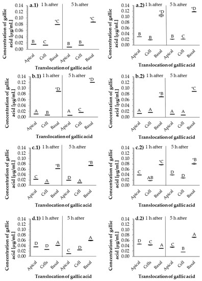 In the fourth step, gallic acid concentrations were compared within the same cell compartment, time, and HT concentration, but between different HTs. Statistically significant differences were represented by capital letters A, B, C and D. Gallic acid passes most rapidly from the apical compartment in Farmatan (Figure 4(b.1)) to the cellular compartment in Contan (Figure 4(c.1)) during the first hour at 12 μg/mL. At this concentration, pure gallic acid is released most slowly from both the apical and cellular compartments of the 3D model (Figure 4(d.1)). The highest concentration of gallic acid (p ≤ 0.05) is measured in the basolateral compartment in Farmatan (Figure 4(b.1)). A very similar pattern of gallic acid passage at the same concentration is also found when sampled at five hours. Significantly (p ≤ 0.05), however, the highest concentration of gallic acid was found in the basolateral compartment in Tanex (Figure 4(a.2)) and the lowest when pure gallic acid was added (Figure 4(d.2)).
