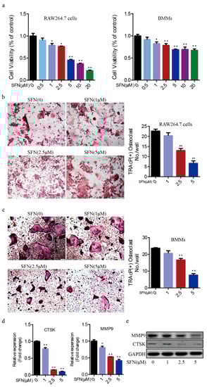 To explore the effect of SFN on the proliferative activity of pre-osteoclasts, we performed a Cell Counting Kit-8 (CCK-8) assay. We found that cell viability decreased along a gradient by treating RAW264.7 cells and BMMs with various concentration SFN (0, 0.5, 1, 2.5, 5, 10, 20 μM, Figure 1a). We cultured RAW264.7 cells and BMMs with RANKL (50 ng/mL) and treated them with various concentrations of SFN (0, 1, 2.5, 5 μM) for 5 days. Tartrate-resistant acid phosphatase (TRAP) staining showed that SFN decreased the number of osteoclasts in a dose-dependent manner (RAW264.7 cells: 22.67 ± 0.88 in the SFN (0) group vs. 20.33 ± 1.45 in the SFN (1 μM) group vs. 13.00 ± 1.00 in the SFN (2.5 μM) group vs. 6.66 ± 1.20 in the SFN (2.5 μM) group; BMMs: 23.67 ± 0.33 in the SFN (0) group vs. 20.67 ± 1.45 in the SFN (1 μM) group vs. 16.67 ± 0.88 in the SFN (2.5 μM) group vs. 7.67 ± 0.88 in the SFN (2.5 μM) group) (Figure 1b,c). Given the cytotoxicity of SFN, SFN at 2.5 μM, which has no obvious cytotoxicity, completely inhibited osteoclastogenesis. In addition, quantitative reverse-transcription polymerase chain reaction (qRT-PCR) and Western blot (WB) analyses showed that SFN suppressed the expression of both cathepsin K (CTSK) and matrix metalloproteinase 9 (MMP9) induced by RANKL (Figure 1d,e).