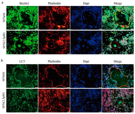 SFN inhibited the accumulation of autophagic light chain 3 (LC3) and Beclin1 within osteoclasts. RAW264.7 cells were induced by 50 ng/mL of RANKL for 5 days, and immunofluorescence (IF) analysis was performed. (a) Representative IF images locating LC3 (green) within the osteoclasts. (b) Representative IF images locating Beclin1 (green) within the osteoclasts. F-actin was stained with phalloidin (red). DAPI (blue) was used to visualize the nuclei.