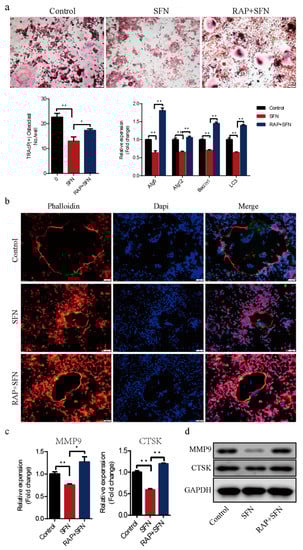 To investigate whether autophagy was involved in SFN-mediated anti-osteoclastogenesis, we used RAP to active autophagy in RAW264.7 cells. The cells were cultured with 50 ng/mL of RANKL in the absence or presence of 2.5 μM SFN and 10 μM RAP for 5 days. We found that RAP rescued the transcription of Beclin1, Atg5, Atg12, and LC3, which was inhibited by SFN (Figure 4a). RAP stimulation reversed SFN inhibition of osteoclastogenesis (number of osteoclasts/well: 22.67 ± 0.88 in the control group vs. 13.00 ± 1.00 in the SFN group vs. 17.33 ± 0.33 in the SFN+RAP group, Figure 4a). Similarly, SFN reduced the size of F-actin rings, whereas RAP reversed this reduction (Figure 4b). As expected, the expression of MMP9 and CTSK at the transcriptional and translational levels exhibited similar changes (Figure 4c,d). These results indicated that autophagy could be involved in SFN-mediated anti-osteoclastogenesis in vitro.