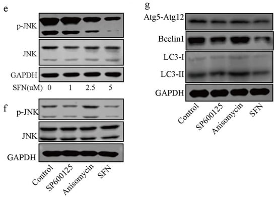 To explore the role of JNK signaling in SFN-mediated autophagy inhibition in the early period of osteoclastogenesis, we stimulated RAW 264.7 cells with SP600125, anisomycin, or SFN for 2 h and then treated them with 50 ng/mL of RANKL for 30 min. As shown in Figure 4e, SFN suppressed the phosphorylation of JNK in a dose-dependent manner. To demonstrate the role of JNK signaling in autophagy during osteoclasogenesis, we treated RAW 264.7 cells with anisomycin, a JNK signaling activator, and SP600125, a JNK signaling inhibitor. WB results showed that anisomycin increased JNK phosphorylation, and SP600125 exerted a negative effect (Figure 4f). After stimulation with SFN for 2 h, RAW 264.7 cells were treated with 50 ng/mL of RANKL for 24 h. We found that the protein levels of LC3-II and Beclin1 were augmented after treatment with anisomycin, whereas SP600125 markedly decreased the expression of these proteins at the translational level (Figure 4g). Considering the suppression of autophagy in SFN-mediated anti-osteoclastogenesis, we suggest that SFN could inhibit autophagy via the suppression of JNK phosphorylation in the early period of osteoclastogenesis.