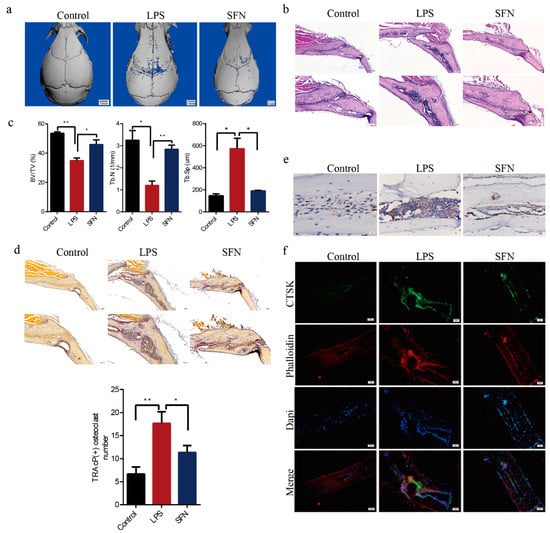 SFN protected against lipopolysaccharide (LPS)-induced calvarial bone destruction in mice. (a) Micro computed-tomography (CT) 3D reconstructed images. Calvarias were fixed, decalcified, dehydrated, embedded, and sectioned. (b) Representative hematoxylin-and-eosin (HE) staining images. (c) Microarchitectural parameter analysis: trabecular bone volume/total volume (BV/TV), trabecular number (Tb.N), and trabecular separation (Tb.Sp). (d) Representative tartrate-resistant acid phosphatase (TRAP) staining images showing osteoclastogenesis in each sample and corresponding statistics. (e) Representative IHC images locating CTSK. (f) Representative IF images of the distribution of CTSK (green). Phalloidin (red) indicates cytoskeleton and bone. DAPI (blue) was used to counterstain the nuclei. Values are mean ± SEM of three independent experiments; * p < 0.05, ** p < 0.01.