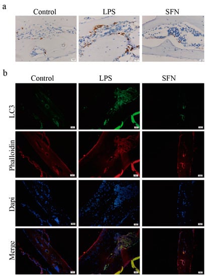 Subsequently, we examined the expression level of LC3 in vivo. As shown in Figure 6a, IHC analysis indicated that the expression of LC3 was induced in the LPS group compared with the control group in mice calvaria, while SFN suppressed this effect. IF analysis showed similar results (Figure 6b).