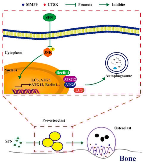 SFN could inhibit osteoclastogenesis by suppressing autophagy through the disruption of the JNK signaling pathway. (Figure 7). Therefore, SFN has great potential for the prevention and treatment of excessive osteoclastic bone destruction due to its ability to suppress this pathway. SFN administration might therefore be a new strategy for preventing and treating bone loss-related diseases.