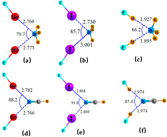 The anisotropies of the MEP and lone pair orbital of the bases fit squarely with the geometries of the bifurcated systems in Figure 2. In all cases, whether the two acids are FBr, FI, or FH, these acids are situated further apart from one another when paired with NCH than with NH3. Figure 5 and Figure 7 are consistent with this wider spacing as the MEP and lone pair orbital around the N atom both deteriorate more slowly as one shifts away from the linear arrangement of NCH vs. NH3, so can tolerate a wider displacement, which in turn minimizes repulsions between the two acids. The same can be said for the structures exhibited in Figure 3 where two bases are paired with a single acid. The two bases are spaced most closely together for FI, which also has the quickest deterioration of the σ-hole and σ * orbital. These two properties diminish much more slowly for FH, which allows 30° greater separation of the two bases in Figure 3c, again minimizing base–base repulsions.