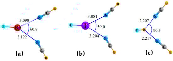 Geometries of triads wherein a pair of NCH bases share a single σ-hole of (a) FBr, (b) FI, and (c) FH, optimized with constraint of equal θ(N··X··N) angles. Distances in Å and angles in degs.