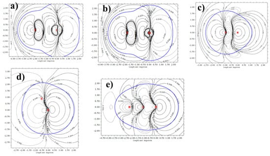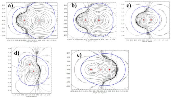 Contour plots of MEP of (a) FI, (b) FBr, (c) FH, (d) NH3 and (e) NCH. Blue line represents a vdW surface defined as isodensity ρ = 0.001 au.