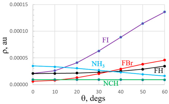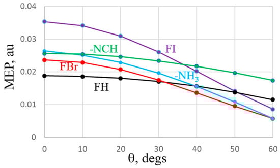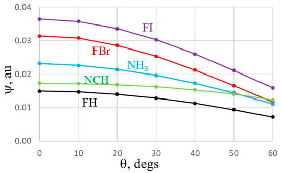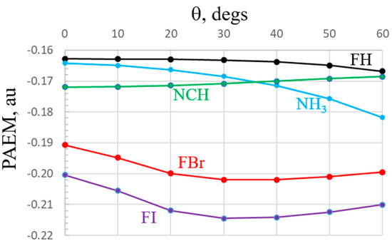 With regard to the electrostatic potential surrounding each monomer, an alternate view of this quantity is known as the potential acting on one electron in a molecule (PAEM) [66] which contains exchange as well as Coulomb elements. This quantity has seen some applications in systems containing halogen and other sorts of noncovalent bonds [67,68]. The PAEMs of the five monomers are displayed in Figure 9 as a function of the displacement from their symmetry line, all with constant distance of 3 Å from the central atom. It might be noted first that unlike the MEP which is positive in the σ-hole regions of the Lewis acids, and negative along the lone pairs, the PAEM is negative for all. Like the MEP, the PAEM of FI and FBr have maxima along the F-X axis, but they do not decline monotonously, instead reaching minima at about 30°. The PAEM of FH is very flat until finally tailing off near 60°. Bases NCH and NH3 behave oppositely from one another. While the latter has its least negative value along the lone pair direction, this quantity is most negative along the lone pair of NCH.