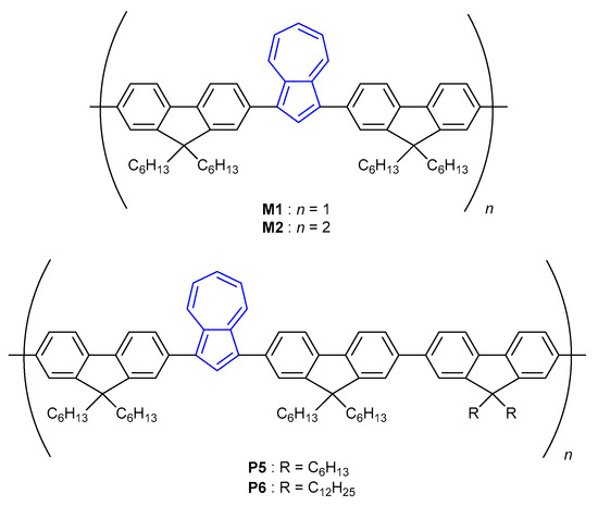 Protonation-dependence fluorescence of azulene has been reported multiple times in the azulene-oligomer field [45]. In 2009, Xu et al. synthesised a series of 1,3-difluorenyl substituted azulene monomer (M1, M2) and polymer (P5, P6) macromolecules (Figure 2) that were shown to exhibit turn-on fluorescence upon titration with trifluoracetic acid (TFA) [46]. It was found that, upon protonation, the LUMO–LUMO+1 gap of the monomers shrinks, affording a decrease in the S1–S2 gap. The authors attributed the resulting change in the HOMO–LUMO gap as the cause of fluorescence.