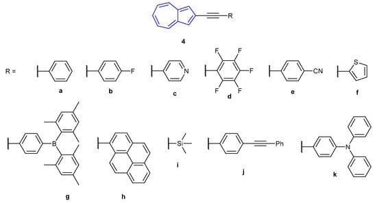 - Koch, M.; Blacque, O.; Venkatesan, K. Syntheses and tunable emission properties of 2-alkynyl azulenes. Org. Lett. 2012, 14, 1580–1583. [Google Scholar] [CrossRef]