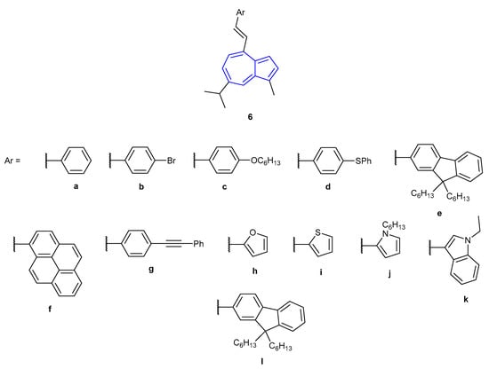 - Birzan, L.; Cristea, M.; Drahici, C.C.; Tecuceanu, V.; Hanganu, A.; Ungureanu, E.-M.; Razus, A.C. 4-(Azulen-1-y1) six-membered heteroaromatics substituted in 2-and 6-positions with 2-(2-furyl)vinyl, 2-(2-thienyl)vinyl or 2-(3-thienyl) vinyl moieties. Tetrahedron 2017, 73, 2488–2500. [Google Scholar] [CrossRef]