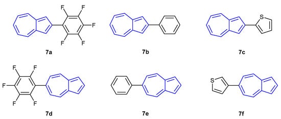 In 2018, Gao et al. explored the effect on fluorescence of substituting azulene at either the 2- or 6-position with aromatic moieties (7a–f, Figure 7) [53]. Similar to the previous observations, fluorescence was dependent on the protonation state of the azulene core. In the neutral state only 7d was found to be strongly fluorescent (λem = 386 nm), whilst the remaining compounds emitted with weak intensities (λem = 408–447 nm). Upon protonation, red-shifted emissions with strong intensities were observed for 7a (λem = 451 nm), 7b (λem = 503 nm) and 7f (λem = 500 nm). The remaining compounds were found to be relatively non-fluorescent in comparison.