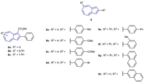 Within the azulene protonation-dependent fluorescence field, there are multiple published examples reported by Shoji and co-workers [54]. A series of 2-arylazulenes were synthesised, of varying electronic nature, on the attached aryl moieties (Figure 8). Azulenes 8a–8c and 9a–9h were all found to undergo fluorescence enhancement when in acidic solution. The presence of the isopropyl group within 8b and 8c gave minor increases in quantum yield and decreases in Stokes shift. The fluorescence properties were found to be dependent on the electronic nature of group at the para-position of the phenyl substituents. Electron-donating moieties (9a, 9b, 9e) afforded lower quantum yields, fluorescence emission at longer wavelengths and greater Stokes shifts. Conversely, the presence of electron-withdrawing moieties (9c) resulted in greater quantum yields and emission at shorter wavelengths.