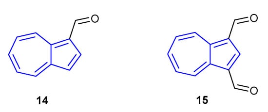 Aside from protonation of the azulene core, azulene monoaldehydes have likewise been shown to exhibit alterations in their fluorescence when protonated (whereby protonation occurs on the aldehyde moiety). Aldehydes 14 and 15 (Figure 11), reported by Li, Gao and co-workers in 2008, were shown to give considerable redshifts (>100 nm) in their emissions when the solvent was changed from EtOH (14 λem = 420 nm, 15 λem = 428 nm) to HClO4 (14 λem = 552 nm, 15 λem = 530 nm) or TFA (14 λem = 537 nm, 15 λem = 530 nm) [58]. The change in emission of dialdehyde 15 was similar enough to monoaldehyde 14 to suggest that only monoprotonation occurs in the former species.