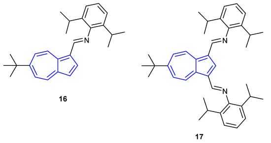 Similarly, the 1,3-connected azulene imine ligands described by Jamali, Bagherzadeh and co-workers (Figure 12) showed considerable changes in their fluorescence properties upon protonation [59]. Both monoimine 16 and diimine 17 were found to be weakly emissive in CH2Cl2 (≈ λem = 450 nm for both species). Upon addition of TFA (10%), large redshifts in emission afforded strong fluorescence at λem = 610 nm and λem = 570 nm for monoimine 16 and diimine 17, respectively. For both species, 1H-NMR studies confirmed that protonation occurs on the imine nitrogen and that, unlike dialdehyde 15, diimine 17 undergoes protonation at both nitrogen atoms.