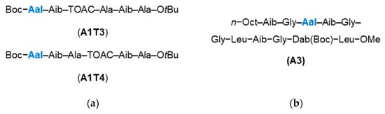 Aal-bearing peptides synthesised by Pispisa et al. in (a) 2004 [76] and (b) 2005 [77]. Aib = 2-Aminoisobutyric acid; Dab = 2,4-diaminobutyric acid.