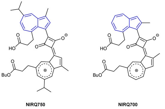 Azulenyl squaraines have found use in biological settings as NIR FRET quenchers for use in peptides. In 2002 Tung et al. developed NIRQ750 (Figure 16), proposing that the extended π-system of the molecule would allow for long wavelength absorbance in the region of 650–900 nm [83]. It was found that NIRQ750 absorbed broadly in the NIR region of 700–800 nm. Absorbance was found to vary with solvent polarity, whereby more polar solvents afforded a bathochromic shift in absorbance. To assess the quenching feasibility of NIRQ750, a fluorescent capase-3 peptide substrate was designed to incorporate NIRQ750 at the N-terminus. At the opposite end of the peptide, attached to a cysteine residue, Alexa-680 C2 maleimide (λex = 679 nm, λem = 702 nm) was used as a NIR-fluorescence donor. When tested against the capase-3 enzyme, a fluorescence response was reported. Tung et al. further contributed to the field the following year with the addition of NIRQ700 (Figure 16) [84]. They proposed that a shorter wavelength NIR-fluorophore could be achieved by removing the electron-donating isopropyl group in NIRQ750, which would afford a hypochromic shift in absorbance. The maximum absorbance of NIRQ700 was found to be blue-shifted, with a broad range in absorbance of 600–750 nm.