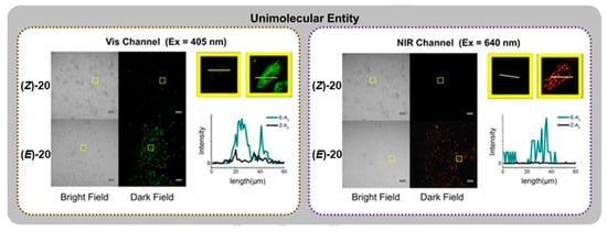 By changing the nature of the phenolic tail group from an n-butyl chain to the polyethylene glycol chain PEG2000-yl, a water-soluble probe (Z)-20 was generated. Identical results were obtained for (Z)-20 in water for the photoisomerisation process. Similarly, dual emission bands were also found for (E)-20. However, unlike (E)-19, the quantum yield of the NIR emission of (E)-20 (λem~800 nm) was found to be roughly equal to that of the quantum yield of the visible emission band (λex = 330 nm, λem~400 nm) when excited at 710 nm. The intense NIR emission was attributed to the favourability of the S0S1 transition allowing emission from the S1 excited stated, as well as the hindered non-radiative decay pathway in the (E)-isomer. The dual emission bands of (E)-20 were exploited for cell imaging in MC3T3-E1 cell lines, which was contrasted with the (Z)-20 isomer (Figure 17). Cell endocytosis was mediated by vesicle formation of the probes, as a result of the PEG tails. When excited at 405 or 640 nm, the (E)-isomer was clearly observed in the cell images. When contrasted to (Z)-20, some fluorescence was observed at the shortest excitation wavelength, whilst no fluorescence was seen at the longer wavelength. The group have further utilised similar photoswitching platforms for acidic sensing [86,87]. It should also be noted that changes in fluorescent emission of azulene derivatives upon photoswitching have previously been reported by Nica et al. [88].