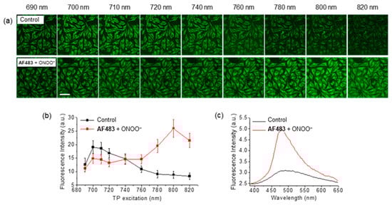 (a) Two-photon excitation of HeLa cells stained with AzuFluor® 483-Bpin (5 μM) with (lower) or without (control, upper) pre-treatment of exogenous ONOO− (100 μM). Wavelengths shown are excitation wavelengths. Incubation time was 30 min. Images were obtained at 400–600 nm emission windows. Scale bar = 50 μm. (b) Average fluorescence intensities at various excitation wavelengths. (c) Fluorescence emission spectrum of AzuFluor® 483-Bpin and AzuFluor® 483-Bpin + ONOO− at λex = 800 nm excitation, taken from the corresponding cell image. Figure reproduced from ref. [89]. AF483 = AzuFluor® 483-Bpin.