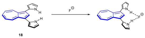 Fluorescence sensing for specific analytes, outside of azulene protonation, is scarce. In 2005, Eichen et al. published a “turn-on” fluorescent azulene sensor for fluoride [60]. The sensor, 1,3-di(2-pyrrolyl)azulene 18, was found to be selective towards tetrabutylammonium (TBA) fluoride over other TBAX salts in both DMSO and DCM (where X = Cl−, Br−, I−, p-toluenesulfonate, BF4−, PF6−). Upon stoichiometric binding of fluoride, a ten-fold increase in fluorescence was observed (λex = 355 nm, λem = 450 nm). The authors noted that the proposed S2S0 fluorescence resulted from a change in conformation of the pyrrole rings. In the unbound species, the rings are expected to be in the plane of the azulene ring. Mechanistically, the authors proposed that fluoride was hydrogen-bonded to the pyrrole moieties, which in turn rotated out of the plane of the azulene (Scheme 2). With the pyrrole rings out of plane, the excited state of the complex was altered, allowing greater emission.