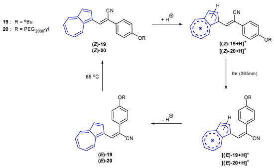 In 2017, Zhu et al. published an example of a fluorescent, NIR-emissive cyanostyryl azulene that was used for cell imaging [85]. Using cyanostyryl azulenes 19 and 20, it was found that fluorescence was dependent on both the protonation state of the azulene and also the alkene geometry. Initial studies were performed on (Z)-19 in CHCl3. Attempts at photoisomerisation to the corresponding (E)-alkene, using both UV and visible light, proved unsuccessful. Upon protonation of the azulene 5-membered ring, photoisomersation of [(Z)-19 + H]+ to [(E)-19 + H]+ was achieved by irradiation at 365 nm (Scheme 3). Both (Z)-19 and [(Z)-19 + H]+ showed strong absorbances at 420 nm, corresponding to a S0S2 transition. Whilst (Z)-19 was found to be only very weakly fluorescent (λex = 330 nm), [(Z)-19 + H]+ was found to be emissive at 500 nm at the same excitation wavelength. In contrast to the (Z)-isomers, the (E)-isomers showed a decrease in absorbance at 420 nm with a new, strong absorbance band at 680 nm suggesting an increase in favourability of the S0S1 transition (and subsequent decrease in the S0S2 transition). Fluorescence emission of [(E)-19 + H]+ was found to be greater than [(Z)-19 + H]+, but emission intensity of (E)-19 (480 nm) was found to be the greatest of all. A new, weaker emission band at the NIR region of 700–900 nm was observed for (E)-19. B3LYP/6-31G studies of the photoisomerisation process suggested a twisted intramolecular charge transfer in the cyanostyryl group in the excited state of the Z isomer, affording a non-radiative decay pathway. The increased steric hindrance and rigidity of the E isomer are thought to disfavour the non-radiative charge transfer decay pathway, affording fluorescence emission.