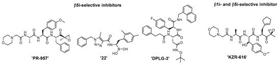 The most advanced iCP inhibitors that are frequently utilized in functional studies of iCP inhibition are represented in Figure 1. Please note that only a selected number of derivatives is depicted; namely, the most studied β5i-selective inhibitor PR-957 [28], β1i and β5i dual inhibitors KZR-616 [29] and ‘compound 22′ [33], as well as the most selective β5i inhibitor DPLG-3 [34]. Structurally, these compounds all possess a peptidic backbone. Moreover, the former three compounds are all endowed with an electrophilic warhead, which reacts with the catalytic Thr1 of the proteasome subunits to form a covalent bond and to confer improved inhibition [24].
