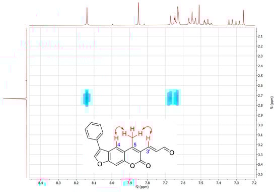 To further confirm the structure of α,β-unsaturated aldehyde 16, two-dimensional NMR experiments correlation spectroscopy (COSY) and Nuclear Overhauser effect spectroscopy (NOESY) were recorded. In the COSY spectrum (Figure 4), a clear correlation between the aldehyde proton CHO and the adjacent C2′-H was observed. In addition, the NOESY experiment showed a coupling between the CH3 protons and C4-H and C3′-H (Figure 5).