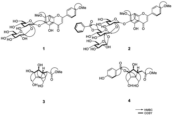 Compound 1 was isolated as a yellow amorphous powder. Its molecular formula was determined as C29H34O16 based on HR-ESI-MS pseudo-ion at m/z 639.1946 [M + H]+ (calcd. for C29H35O16, 639.1920). The 13C-NMR and DEPT spectra of 1 showed the presence of 29 carbons, including nine non-protonated carbons (one carbonyl, five oxygenated), 16 methines (ten oxygenated), two oxygenated methylenes, and two methoxy carbons (Table 1). The HMBC correlations between proton signals of two methoxys at δH 3.82 and 3.86 (each 3H, s) and C-4’ (δC 162.4) and C-7 (δC 158.3) suggested their locations at C-4’ and C-7, respectively (Figure 2). Besides, the location of a sophoroside was also confirmed by HMBC correlation between H-1’’ (δH 5.29) and C-6 (δC 127.9). Compound 1 was identified as 5,6-dihydroxy-7,4’-dimethoxyflavone-6-O-sophoroside, which was previously identified from C. ovata [9]. Although its 1H-NMR data were reported, 13C-NMR data were not fully assigned. Therefore, we herein report fully assigned 13C-NMR data. The UV, IR, CD, NMR (1H, 13C, HSQC and HMBC) and HR-ESI-MS spectrum of compound 1 are shown in Supplementary Figures S1–S8.