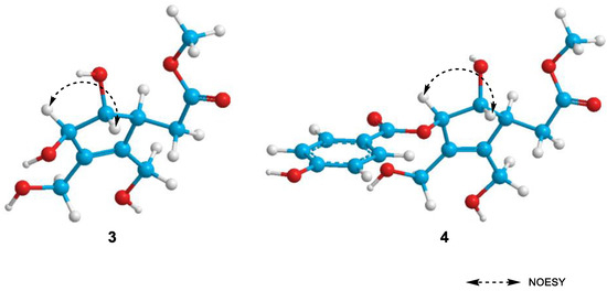 Compound 4 was also isolated as a brown oil. Its molecular formula was confirmed as C17H20O8 by HR-ESI-MS ion at m/z 353.1207 [M + H]+ (calcd. for C17H21O8, 353.1231). The 1H- and 13C-NMR spectrum of 4 also exhibited (7R)-hydroxyeucommic acid analog as those of compound 3 (Table 2). Instead of a hydroxyl group at C-7 in compound 3, compound 4 consisted of a p-hydroxybenzoic acid. The HMBC spectrum gave a three-bonded correlation between C-11 (δC 168.1) and H-7 (δH 5.87) (Figure 2). The stereochemistry of 4 was also determined by NOESY and the CD spectra, as with compound 3. The NOE interaction was observed between H-6 (δH 4.17) and H-7 (δH 5.87), but not between H-5 (δH 3.24) and H-6 (δH 4.17) (Figure 3). The CD spectrum of 4 also showed a negative Cotton effect at 204.0 nm (Δε −18.57), suggesting its R-configuration at C-7 (Figure 4). Thus, the structure of 4 was elucidated to be (7R)-3-methoxy-(7-O-p-hydroxybenzoyl)eucommic acid. The UV, IR, NMR (1H, 13C, HSQC and HMBC) and HR-ESI-MS of compound 4 are shown in Supplementary Figures S24–S30.