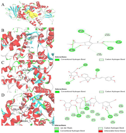 Binding mode of 3, 9, and acarbose in the active site of a-glucosidase (A). Receptor–ligand interaction of compounds 3 (B), 9 (C), and acarbose (D) on 2D and 3D diagram.