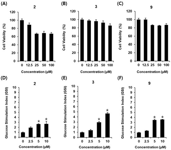 Effect of compounds 2, 3, and 9 on glucose-stimulated insulin secretion in INS-1 cells. Effect of (A) compounds 2, (B) 3, and (C) 9 on the viability of INS-1 cells following 24 h of treatment, compared with that of the control (0 μM), as determined by the MTT assay. Effect of (D) compounds 2, (E) 3, and (F) 9 on glucose-stimulated insulin secretion in INS-1 cells following 1 h of treatment, compared with that of the control (0 μM), as determined by the GSIS assay (n = 3 independent experiments, * p < 0.05 compared to the control (0 μM), Kruskal–Wallis non-parametric test). The data are presented as the mean ± SEM.