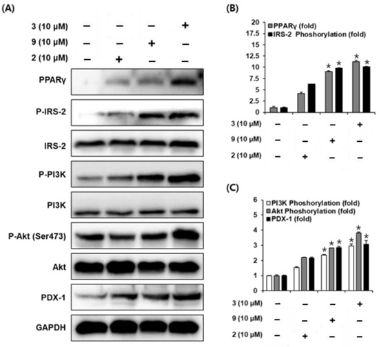 To evaluate the role of peroxisome proliferator-activated receptor γ (PPAR-γ), insulin receptor substrate-2 (IRS-2), phosphatidylinositol 3-kinase (PI3K), Akt, and pancreatic duodenal homeobox-1 (PDX-1) in the effect of compounds 2, 3, and 9 on GSIS, we measured these protein levels in pancreatic β-cells and demonstrated that the protein expression levels of PPAR-γ, P-IRS-2 (Ser731), P-PI3K, P-Akt (Ser473), and PDX-1 were increased by treatment with compounds 2, 3, and 9 at 10 μM compared to untreated controls. As reported, PPARγ has been shown to regulate the expression of genes involved in insulin secretion in pancreatic β cells [25]. However, in order to avoid the potential side effects of synthetic antidiabetic compounds such as thiazolidinediones and troglitazone, the PPAR-γ agonists, finding antidiabetic compounds from natural products is necessitated. Another role of PPAR-γ is known to regulate the PDX-1 gene promoter in pancreatic β cells [26,27]. Others have reported that troglitazone increases the expression of PDX-1 in INS-1 cells [26]. This prompted us to study the effect of compounds 2, 3, and 9 on the expression of PPAR-γ and PDX-1 in INS-1 cells. Thus, the expression of PPAR-γ and PDX-1 was evaluated with Western blot. As shown in Figure 7, treatment with compounds 2, 3, and 9 increased the expression of PPAR-γ and PDX-1. Subsequently, we assessed whether treatment with compounds 2, 3, and 9 increases the serine phosphorylation of IRS-2 (Ser 731), phosphorylation of PI3K, and serine phosphorylation of Akt (Ser473). It is well known that the IRS-2 signaling pathway is essential to the function of pancreatic β cells. In addition, the loss of IRS-2 expression in mice is linked to development of type 2 diabetes due to insufficiency of pancreatic β cells [28]. In this signaling pathway, Akt and its downstream protein, PI3K, can be activated through phosphorylation of IRS-2 [29]. It has also been reported that upregulation of the PI3K/Akt signaling pathway promotes proliferation of pancreatic β cells [30]. As shown in Figure 7, treatment with compounds 2, 3, and 9 increased the expression of IRS-2, PI3K, and Akt. Taken together, these results suggested that compounds 2, 3, and 9 not only upregulate the expression of PPAR-γ and PDX-1, but also upregulate the phosphorylation of IRS-2, PI3K, and Akt in INS-1 cells. These results enhanced the understanding of the underlying mechanism of compounds 2, 3, and 9 on amelioration of GSIS. However, further study on the mode of entry of compounds 2, 3, and 9 into the pancreatic β cells and its effect in animal models for diabetes should be evaluated.