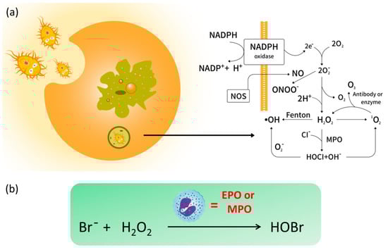(a) The intracellular generation of reactive oxygen species (ROS) and (b) the formation of endogenous hypobromous acid (HOBr) catalyzed by eosinophil peroxidase (EPO) or myeloperoxidase (MPO).