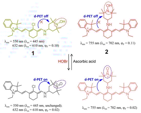 Not until 2012 did Han’s group report the construction of cyanine-based fluorescent probes 1 and 2 for the selective recognition of HOBr (Figure 3), which is the first example of a fluorescent probe for HOBr [68]. In this system, the cyanine platform served as a signaling fluorophore, while the 4-hydroxylamino-2,2,6,6-tetramethylpiperidine-N-oxyl (TemOH) moiety was incorporated both as the reaction site to HOBr and an effective fluorescent modulator. Despite an almost complete lack of changes in the absorption spectrum for the two probes upon treatment with HOBr under simulated physiological conditions (0.2 M PBS, pH = 7.4, 10 μM probes), a remarkable ratiometric fluorescence response for 1 and fluorescence quenching behavior for 2 were observed. The probe 1 exhibited two absorption maxima at 445 nm and 610 nm, together with the corresponding fluorescence maxima at 550 nm and 632 nm. The addition of HOBr did not cause a change of the fluorescence intensity at 550 nm but led to a decrease of the fluorescence intensity at 630 nm (quantum yield varying from 0.10 to 0.02), from which a 13-fold-decrease of the ratiometric fluorescence response F632 nm/F550 nm could be deduced while increasing the amount of HOBr from 0 to 110 μM. This unique recognition mechanism could be ascribed to HOBr-mediated oxidation of the TemOH moiety to the corresponding oxyammonium cation, which resulted in a donor-excited PET (d-PET) quenching effect. In addition, further addition of ascorbic acid to the in situ system gave rise to the recovery of its fluorescence emission due to the ascorbic acid-induced reduction of the oxyammonium cation, resulting from the inhibition of the d-PET process. The fluorescence intensity could also be turned off and on repeatedly with the alternate addition of HOBr and ascorbic acid in at least three cycles. With regard to cyanine probe 2, it exhibited NIR absorption and emission located at 702 nm and 755 nm (Φ = 0.11) in the same media, respectively. Similarly to 1, compound 2 responded to the HOBr/ascorbic acid redox cycle in a sequential manner, but the latter dye suffered from serious bleaching after three cycles. Importantly, the two probes showed low toxicity to the RAW264.7 cell line and localized in the cytoplasm, and so they could be successfully used to monitor intracellular HOBr.
