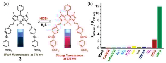 (a) Ratiometric fluorescent probe 3 on Se-BODIPY for selective recognition of HOBr followed by H2S in a redox cycle; (b) fluorescence intensity ratio (F635 nm/F711 nm) of 3 upon reacting with various ROS for 60 min. Reproduced with permission from Reference [69]. Copyright 2013 Royal Society of Chemistry.