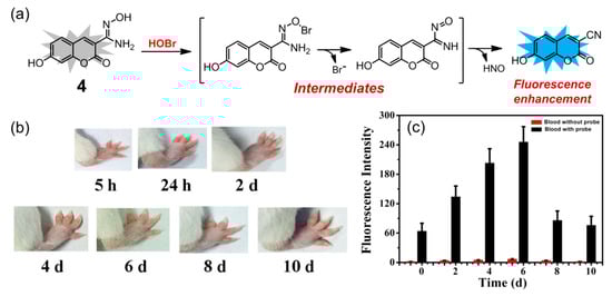 In 2020, Zeng and coworkers reported a coumarin-based fluorescent probe 4 for selective detection of HOBr (Figure 5a), whose sensing mechanism was based on HOBr-mediated oxidation of amidoxime to the corresponding cyano group [75]. Probe 4 had good water solubility and exhibited a 5 nm red shift (from 395 to 400 nm) in its absorption spectrum in PBS buffer solution (pH = 7.4) upon addition of HOBr. On the other hand, the fluorescence intensity of 4 at 460 nm was greatly enhanced with the quantum yield varying from 0.0445 to 0.79 in the presence of HOBr, which could be ascribed to the ICT effect of the resultant product. The sensing ability was demonstrated to be optimal in the pH range of 7.0 to 8.0. This probe had a quite fast response time (less than 30 s) and the detection limit of HOBr was calculated as low as 30.6 nM. Probe 4 displayed a good selectivity for HOBr over other potential interferences, including ROS, RNS, various amino acids, and metal ions. Moreover, the content of HOBr in blood was monitored by the probe after successful establishment of an arthritic model mice (Figure 5b). The fluorescence intensity of 4 in the arthritic mice’s blood gradually increased within 6 days and reached a maximum value on the sixth day (Figure 5c), which was 4-fold higher than the value of untreated blood samples, indicating that probe 4 has potential for early diagnosis and evaluation of inflammation in clinical practice.