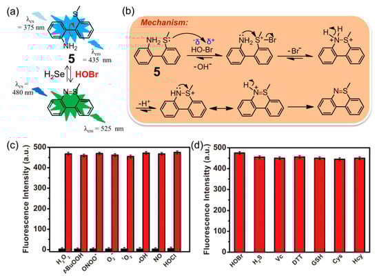 (a) Fluorescent probe 5 for selective recognition of HOBr followed H2Te; (b) the mechanism of oxidative cyclization of the amino group and S-methyl group catalyzed by HOBr; (c) fluorescence intensity of 5 after adding various active oxidizing species or (d) active reducing species. Reproduced with permission from Reference [76]. Copyright 2018 American Chemical Society.