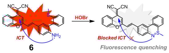 Dicyanomethylene-benzopyran (DCMB) derivatives are well-known NIR fluorophores with good stability and large Stokes shifts owing to the distinct push-pull effect and extended π-conjugation, which are ideal platforms to construct potent NIR fluorescent sensors for various analytes [78,79,80,81]. Conjugation between DCMB and the skeleton of compound 5 ought to afford a unique fluorescent probe for HOBr. As expected, compound 6 has demonstrated to be an excellent fluorescent probe for markedly selective recognition of HOBr over the ROS, reactive nitrogen species (RNS), reactive sulfur species (RSS), common biological amino acids and metal ions (Figure 7), although the probe worked in a fluorescence quenching manner [82]. The absorption centered at 478 nm of free probe 6 in PBS-CH3CN (3:2, v/v, pH 7.4) solution sharply decreased, accompanied by appearance of two new peaks at 392 nm and 448 nm in the presence of HOBr. Meanwhile, probe 6 showed strong fluorescence emission at 655 nm due to the efficient ICT process, which was mostly quenched and red-shifted to 700 nm together with a remarkable fluorescence color change from red to colorless after treatment with HOBr. The corresponding sensing mechanism could also be attributed to HOBr-triggered cyclization, and the reaction product lacked satisfactory ICT. The reaction kinetics of 6 with HOBr took about 8 min to level off. Probe 6 maintained its sensing ability in a wide pH range (pH = 4.0–8.0) with a detection limit of 0.66 μM. Moreover, this probe had a low cytotoxicity and was successfully applied for monitoring HOBr in MCF-7 cells.