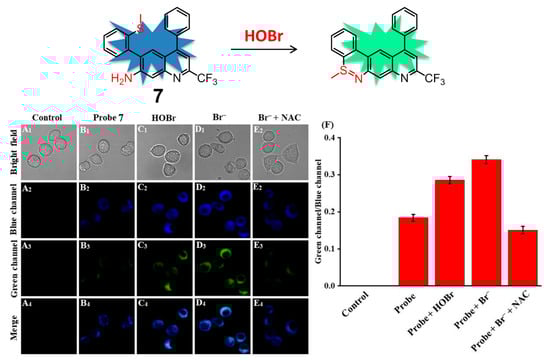 Ratiometric fluorescence probe 7 for HOBr (top) and its fluorescence imaging of HOBr in RAW 264.7 cells (down). Cells were incubated with (A) control; (B) probe 7; (C) probe 7 then treated with HOBr (50 μM); (D) probe 7 then treated with NaBr (100 μM); (E) NaBr (100 μM) and NAC (100 μM, a scavenger of HOBr) then treated with probe 7; (F) Fluorescence intensity ratios (Fgreen/Fblue) from (A–E). Blue channel: 455 nm–505 nm, green channel: 545 nm–645 nm, λex = 434 nm. Reproduced with permission from Reference [83]. Copyright 2020 Elsevier.