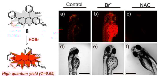 On the basis of the same coupling/cyclization recognition mechanism, rhodamine derivative 8 (Figure 9) was rationally constructed by Tang and coworkers, which is the first example of a mitochondria-targeting fluorescent probe designed for monitoring native HOBr in vivo [91]. Rhodamine 110 can serve as both the fluorophore and the mitochondria-targeting unit, avoiding chemical modification of the parent dye with additional mitochondria-targeting groups. In HEPES buffer solution (10 mM, pH 7.4, containing 0.3% DMSO as a cosolvent), the probe 8 displayed the excitation and emission peaking at 495 and 530 nm, respectively, whereas the reaction product of 8 after treatment with HOBr showed the excitation and emission maxima in the NIR region, located at 624 and 663 nm, respectively. Benefitting from the high fluorescence quantum yield of the reaction product (Φ = 0.68) in the NIR region, which can greatly enlarge the signal-to-noise ratio and improves the detection sensitivity, probe 8 had an extremely low detection limit for HOBr (20 pM) and fast response time (ca. 3 min). Meanwhile, this molecule possessed low cytotoxicity (IC50 = 650 μM) and persistence of the fluorescence sensing ability for HOBr in a wide pH range (pH = 2.0–12). This probe did not exhibit any obvious interference by various bioanalytes including competing ROS, RNS, and commonly-seen metal ions and amino acids. It was also successfully utilized to image native HOBr in mitochondria of HepG2 cells and zebrafish. Taking the imaging of zebrafish as an example, in comparison to Figure 9a,c, a significant fluorescence enhancement was observed with the feeding of Br− followed by probe 8 (Figure 9b), demonstrating that 8 was capable of monitoring the exogenous HOBr in vivo as HOBr can be only generated from Br− in this case.