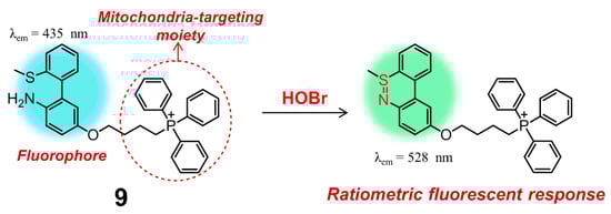 Apart from rhodamine dyes, these fluorophores decorated with one positively charged group, e.g., the classic pyridinium cation and triphenylphosphonium (TPP), can also have excellent mitochondrial targeting ability owing to the inherent charge attraction from the negative potential of inner mitochondrial membrane [92]. According to this strategy, Tian and Huang introduced a TPP group onto the backbone of 5, leading to obtain another mitochondria-targeting ratiometric fluorescent probe 9 for selective recognition and biosensing of HOBr with high selectivity and sensitivity (Figure 10) [93]. In PBS solution (pH = 7.4, containing 0.5% DMSO), probe 9 behaved almost in the same fashion to 5, indicative of the nearly-identical fluorescence emission centered at 437 nm. The initial emission of 9 gradually decreased with the addition of HOBr, accompanied by the enhancement of a new emission peak at 528 nm. Compound 9 had a faster response time (30 s) and a higher detection limit (1.8 ± 0.2 nM) for HOBr as compared to those of 5. The low cytotoxicity, good biocompatibility and appreciable tolerance to a wide pH range (pH = 4.0–9.0) allowed probe 9 to function very well in real-time imaging and biosensing of HOBr in the mitochondria of RAW264.7 cells. More importantly, the work shown here clearly demonstrated that endogenous HOBr could also be generated from O2•−-induced oxidative stress rather than only the Br− stimulation in mitochondria.