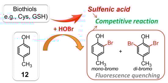Selective recognition and monitoring of HOBr can be achieved through substitution reactions, where HOBr acts as either the reactant or catalyst. In 2018, the first substitution-based fluorescent probe 4-methylphenol (p-cresol, 12, λex = 260 nm, λem = 305 nm) was described to react with HOBr (Figure 12), resulting in formation of nonfluorescent bromination products (i.e., monobromo-, dibromo-cresols) [101]. Under the specific conditions, compound 12 demonstrated a detection limit for HOBr down to 0.37 μM. Intriguingly, the biothiols (e.g., Cys, GSH, Hcy, etc.) could also react wih HOBr, giving rise to the corresponding oxidation product, sulfenic acid. The decreasing fluorescence intensity of 12 caused by this HOBr scavenging antioxidant was not comparable to that of the HOBr by itself. As a result, the competitive reaction of HOBr between 12 and biothiols also allowed the probe to determine the HOBr scavenging activity of various biothiols.